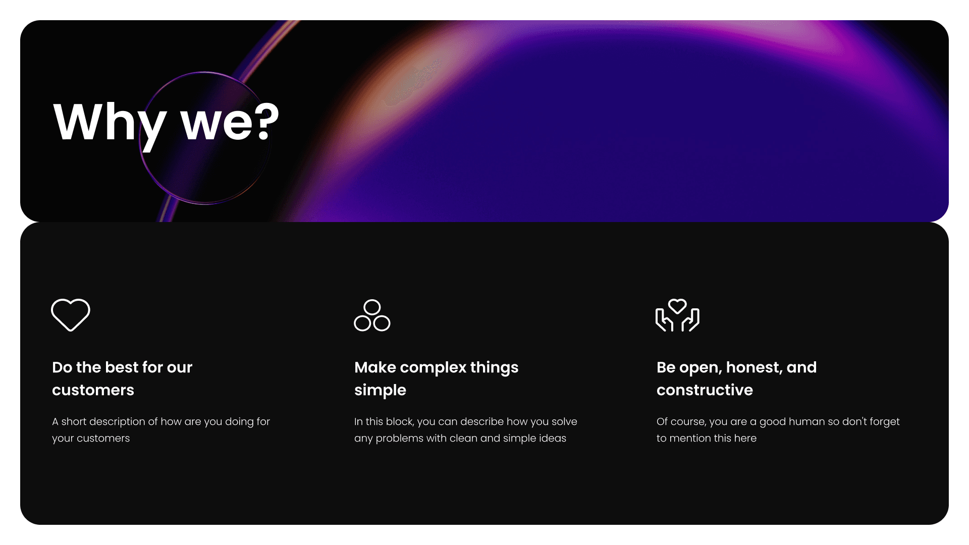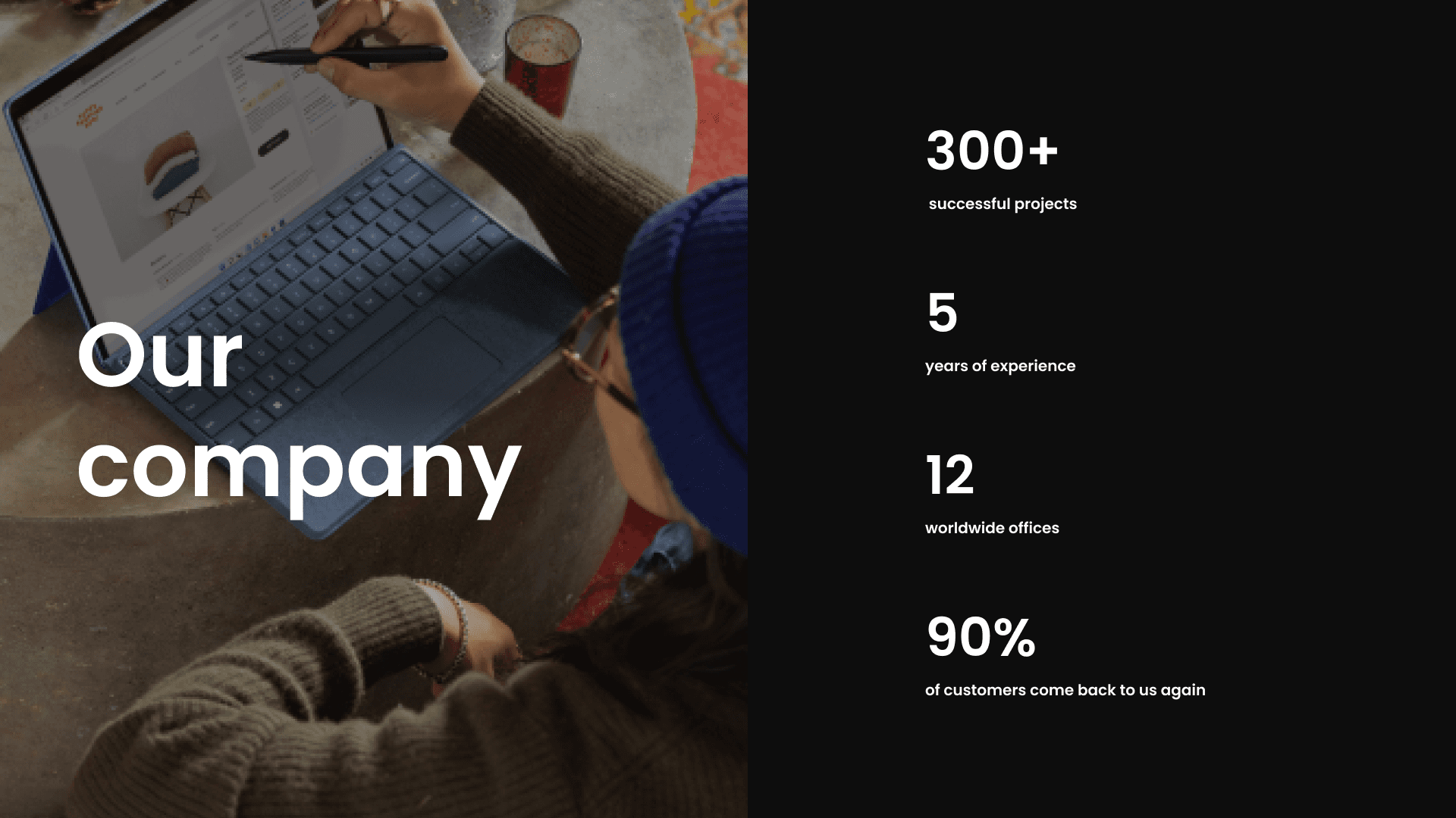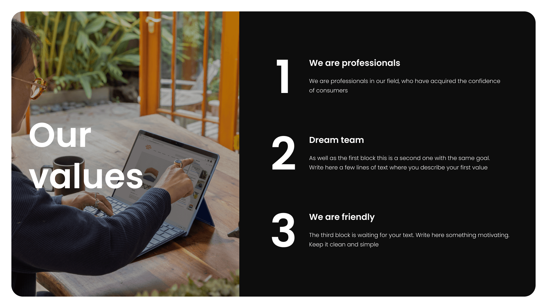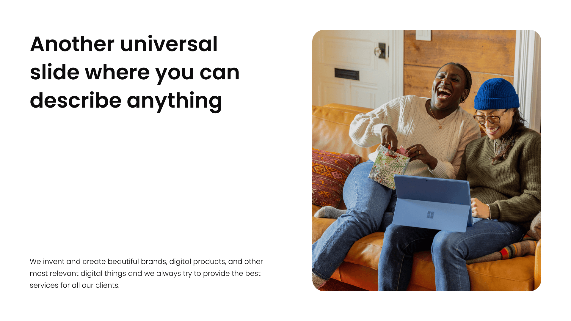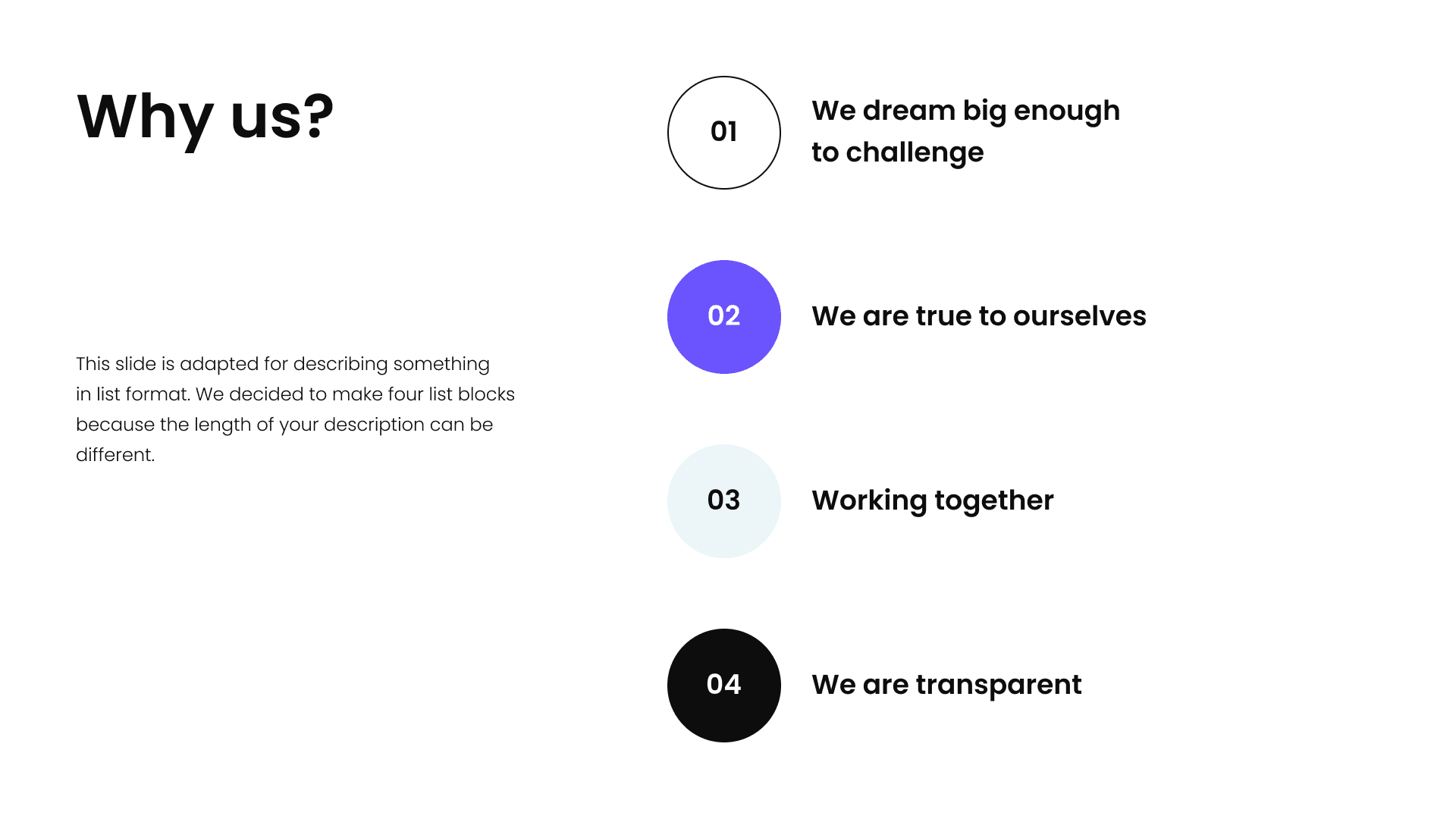 Describe anything. This is a slogan of About category. A whole bunch of slides from basic just text to creative and complex slides to describe any type of information. You can find here slides that help you explain your idea or product as well as why we, our values, facts, and problem and solution slide templates.